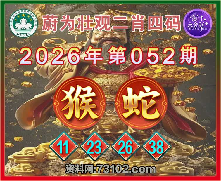 052期:『蔚为壮观』 🍔二肖四码🍔【猴蛇】【11.23.26.38】开:蛇38准彩民验证